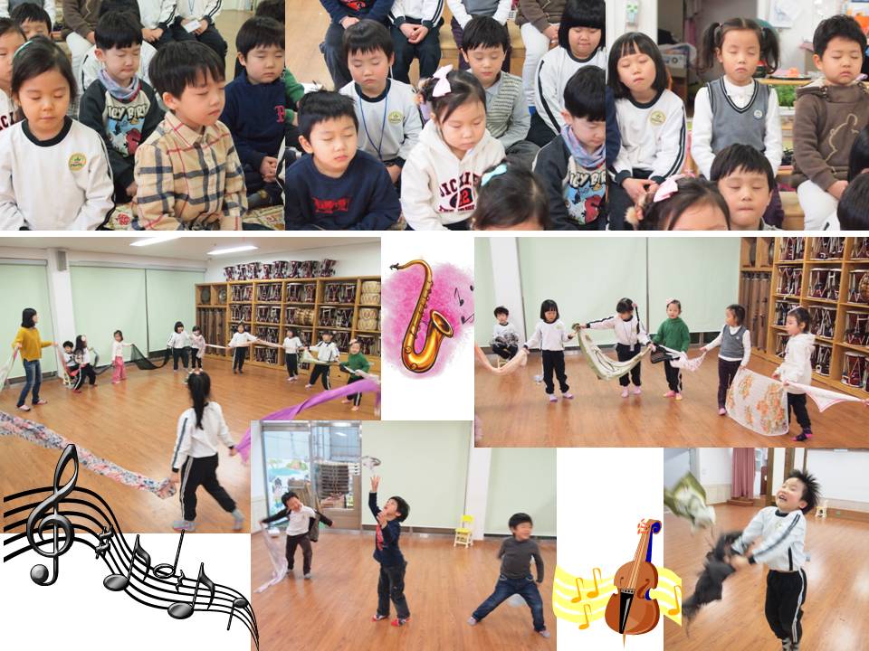 음악을 감상한 어린이들은 가지고 온 스카프로 겨울바람과 눈송이 등 겨울의 느낌을 자유롭게 표현해 보았습니다. 음악의 흐름과 세기에 따라 스카프를 흔드는 친구들도 있고 뭉쳐서 던지는 친구, 스카프를 돌리는 친구 등 서로 표현한 것을 보고 새로운 것을 생각해 또 다르게 표현했답니다. 또 스카프를 활용하여 높이던지기, 스카프 따라 걷기 등 다양한 놀이도 하며 즐거운 시간을 보냈습니다.#. 추억 만들기