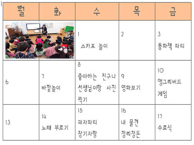 <놀이시간 / 좋아하는 친구나 선생님이랑 사진 찍기 / 스카프놀이 / 바깥놀이 / 앵그리버드 게임 / 과자파티 / 동화책 파티 / 6살 동생을 위한 정리하기/ 장기자랑 / 영화보기 / 놀이/ 북극곰 만들기> “하루에 하나씩 하면 되겠다.” 꽃잎이들의 즐거운 추억 만들기 이야기를 기대해 주세요.