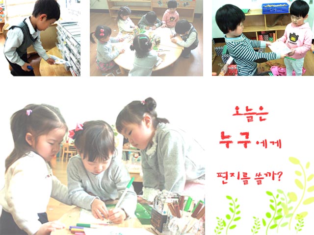 *.학기 초 언어영역에서 놀이를 하는 아이들의 모습에서는 긁적이기, 그림그리기를 하며 스스로 만족하며 놀이하는 즐거움을 느꼈습니다. 하지만 조금씩 시간이 지나면서 아이들의 모습에서는 [편지]라는 것이 소통의 매개체가 되어 서로의 마음을 표현하고, 확인하는 모습을 볼 수 있습니다. 아이들은 손을 잡고, 몸으로 부딪히며 직접적인 접축을 통한 놀이를 하지 않더라도 관계의 끈을 이어가는 방법을 터득 해 갑니다. “나 편지 많이 받았어.” “좋으니깐 편지 쓰는 거예요.” “나 이제 글자 잘 쓰지요?” “예전에는 친구한테 그림 그리고 하트 그려서 줬는데 이제는 친구이름도 잘 적을 수 있어서 좋아요.”