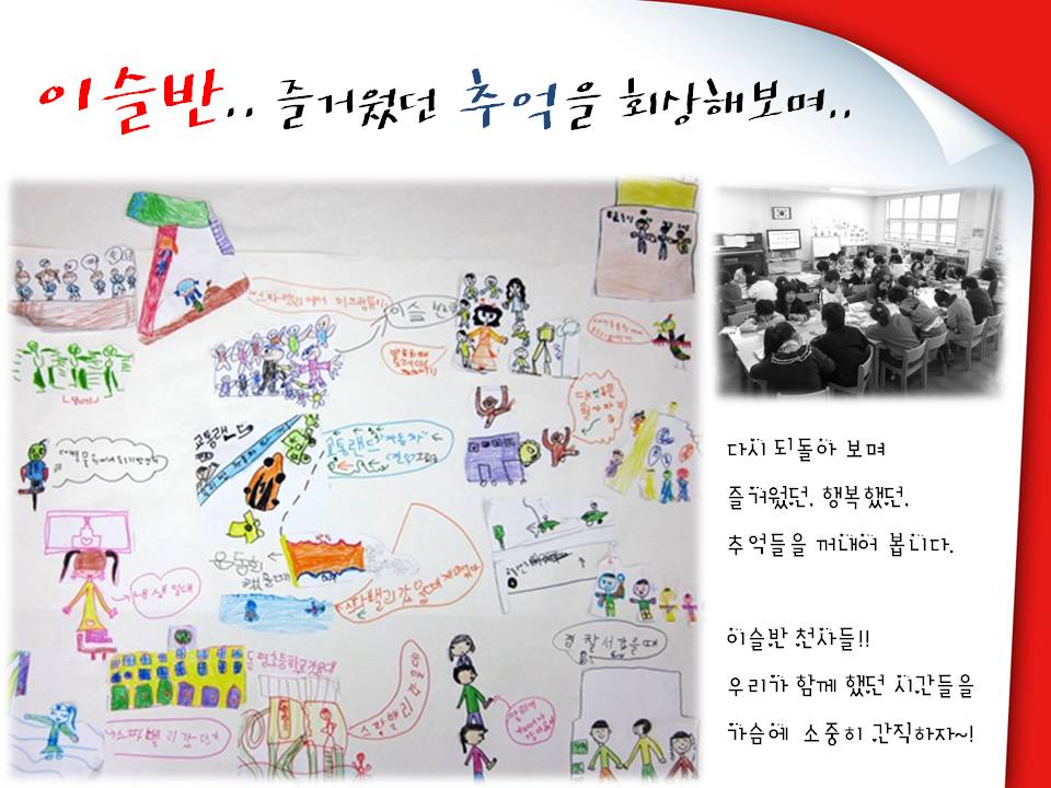 ‘우리’, ‘함께’, ‘하나’ 라는 단어를 그 언제보다 가슴깊이 새길 수 있었던 한해를 돌아보며 혼자가 아니였기에 가능할 수 있었던 많은 일들은 함께였기에 더 많은 행복을 쌓으며 보낼 수 있었습니다. 돌아보면 즐거운 일들만 가득하지만 더 많은 추억을 쌓지 못한 것이 아쉽기만 합니다. 하지만 슬픈 이별은 또 다른 시작을 의미하기에 이슬반 친구들의 행복하고 힘찬 하루를 응원해봅니다.