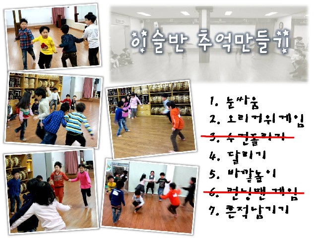 “이슬반 친구들과 장기자랑 했을 때가 가장 즐거웠어! 내가 가장 잘하는 것을 친구들에게 보여줘서 너무 기분이 좋았고 또 모두 다 즐겁게 많이 웃어서 행복했어!” “여름에 캠프 가서 수영했을 때가 기억에 남아~ 물장난도 치고 미끄럼틀도 타고 정말 신나는 하루였어!” “한림 가족 운동회 했을 때 달리기 일등 했을 때가 가장 좋았어! 응원도 열심히 하고 재미있는 경기도 많이 하고 정말 보람된 하루였어!” “난 바깥놀이 했을 때가 가장 재미있었어~ 봄엔 꽃도 관찰하고 여름엔 모래놀이도 하고 가을엔 단풍씨앗도 주워서 시합도 하고!” “난 발표회 했을 때가 가장 즐거웠어~ 열심히 준비한 우리들의 무대를 가족들에게 보여줬을 때 정말로 뿌듯했어! 그리고 박수도 많이 쳐주고 칭찬도 많이 해줘서 기분이 날아갈 것 같았어!” “난 전시회 했을 때가 제일 기억에 남아~ 쓰레기를 모아서 멋진 자전거도 만들어 보고 분리수거함 통도 디자인해서 분리수거도 해보고 감사합니다 UCC촬영도 너무 신났어~” “나는 대전동물원에 졸업여행 갔을 때가 제일 좋았어! 신나는 놀이기구도 타고 이슬반 친구들과 만들었던 소중한 추억들 잊지 못할거야” 우리가 함께 보낸 행복한 시간들을 떠올려 보며 즐거워하는 아이들..저마다의 생각 주머니에 이슬반의 추억은 각각 다를테지만 우리 함께 소중한 추억속에 행복함과 설렘의 기억들은 영원히 기억되길 소망해 봅니다.<이슬반 추억만들기>