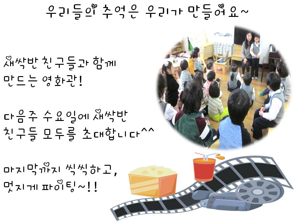 “형님반으로 가면 새싹반 친구들과 헤어져야 해서 슬퍼.” “친구들과 함께 합창도 하고, 게임도 하는게 좋았는데...” “친구들과 함께 놀이 했던게 제일 재밌었는데!” “놀이? 병원놀이! 엄마놀이!” “영화관 놀이도 했었잖아.” “맞아! 팝콘도 팔고~” “친구들이 즐거운 인형극도 보여줬었는데~” “우리가 다시 영화 만들어서 친구들에게 보여주자!” “그래! 진짜 팝콘도 있으면 더 좋겠다.” “재밌겠다! 새싹반 영화관~” 새싹들의 마지막 즐거운 추억 만들기를 기대해 봅니다.한림유치원에 오는 새 친구들에게..