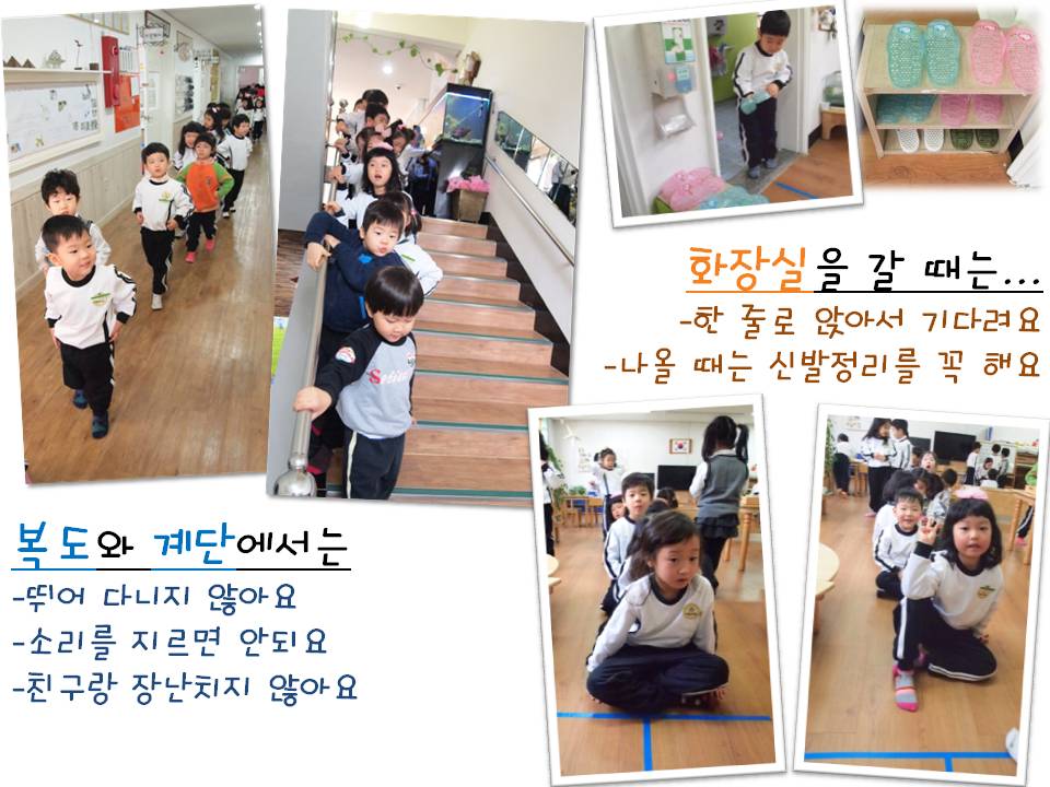 “쿵쿵 거인발소리를 내면 안되요.”, “소리 지르면 다른 반에게 방해가 될 수 있어요.”, “계단에서도 친구랑 장난치지 않고 한 줄로 가야해요.”…