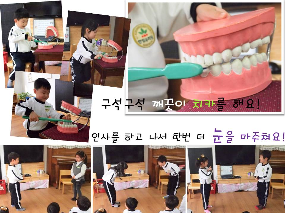 - 양치질을 할 때도 세균을 모두 없애는 방법이 있대요. 친구들과 함께 모형을 이용하여 윗니 아랫니 혀 천장 구석구석 닦는 연습을 해보고 양치질 후의 입안 속 세균을 모두 씻어 내기 위해 다섯 번 이상 입 안을 헹구는 것도 연습합니다.
