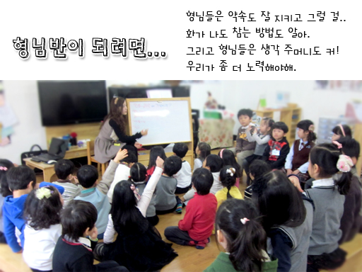-방학동안 즐거운 추억과 함께 더욱 커진 마음의 주머니를 안고 온 하늘반 어린이들. 서로의 이야기에 귀 기울이고, 공감하며 이야기 나누는 모습을 보니 어느새 많이 자라난 모습에 가슴 한켠이 따뜻해집니다. 2012년 한 해에는 하늘반 어린이들이 행복한 추억을 더욱 많이 쌓아갈 수 있기를 바랍니다.★형님반에 가려면?★