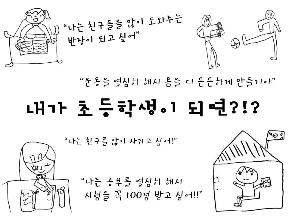 "나는 지금 보다 키도 더 크고 더 똑똑해져서 친구들이 모르는 것을 다 알려주는 척척박사가 될꺼야~" "난 동생을 잘 돌보는 형님이 되고 싶어~ 부모님을 더 많이 도와 주고 싶거든!" "나는 책 읽는걸 좋아하는데 초등학교에 가면 도서관이 있는데 거기서 책을 많이 빌려보고 싶어~" "나는 공부를 많이 많이 할거야~ 시험을 꼭 100점 받아서 엄마를 기쁘게 해드릴거야~"