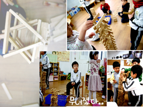 “세워서 쌓으면 자꾸 넘어져. 눕혀서 쌓으면 더 잘 쌓아져.”“받침을 만들면 되.”
