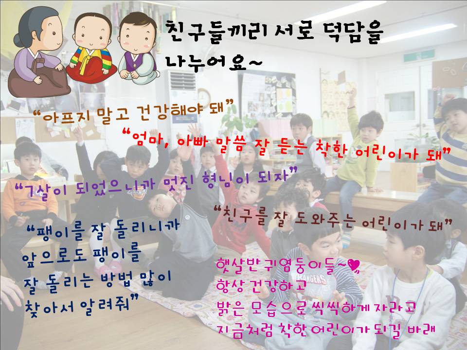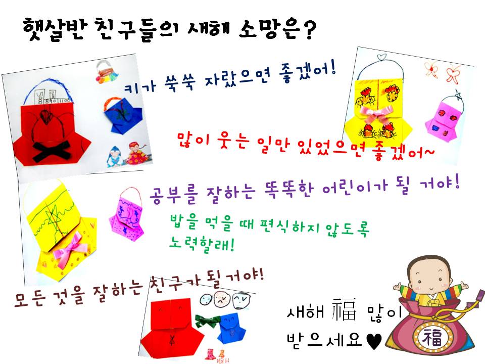 2012년 새해가 되어 친구들과 새해의 의미와 덕담에 대해서 이야기를 나누어보았답니다. 새해는 해가 바뀌고 나이를 한 살 더 먹는 것을 의미합니다. 새해에는 떡국도 먹고 연날리기도 하며 어른들께 세배를 하면 덕담을 해주십니다. 교사: 새해에는 어른들께서 너희에게 멋진 어린이로 자라도록 좋은 말씀을 해주시는 것을 덕담이라고 해요. 너희들은 어떤 덕담을 듣고 싶어요?“키가 쑥쑥 자라라는 이야기요”“엄마,아빠 말씀 잘 들으라는 이야기요. 햇살반 친구들끼리도 서로에게 멋진 덕담을 합니다. “우리 7살 형님이 되었으니까 규칙을 잘 지키는 멋쟁이가 되자”“친구를 잘 도와주고 친절한 친구가 되도록 하자” 다가오는 설날에 예쁜 한복을 입고 가족들과 함께 소중한 시간이 되길 바랍니다.<햇살반 친구들의 새해소망은?>