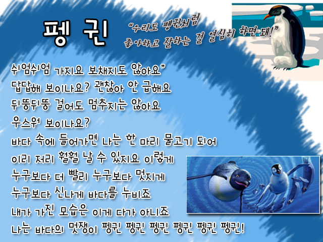 -펭귄의 겉모습만 보고 판단하는 사람들에게 펭귄의 숨겨진 재능에 대해서 이야기 하고 있는 이 노래!