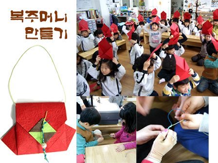 옛날 한복에는 물건을 넣을 수 있는 주머니가 없었기 때문에 사람들이 주머니를 따로 만들어 허리에 차고 다니거나 손에 달고 다녔죠. 그리고 복을 불러 들이는 의미로 설날에 복주머니를 선물하기도 하였답니다. 그래서 어린이들과 함께 새해에 복을 많이 받으라는 의미로 복주머니를 만들기로 하였답니다.