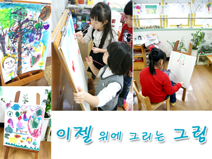 어린이들은 새로운 방법에 흥미를 보이며 저마다의 그림을 표현하기 시작합니다. 이젤 위에 그려내는 어린이들의 이야기는 어떤 것일까요? 그 이야기가 궁금해 집니다.