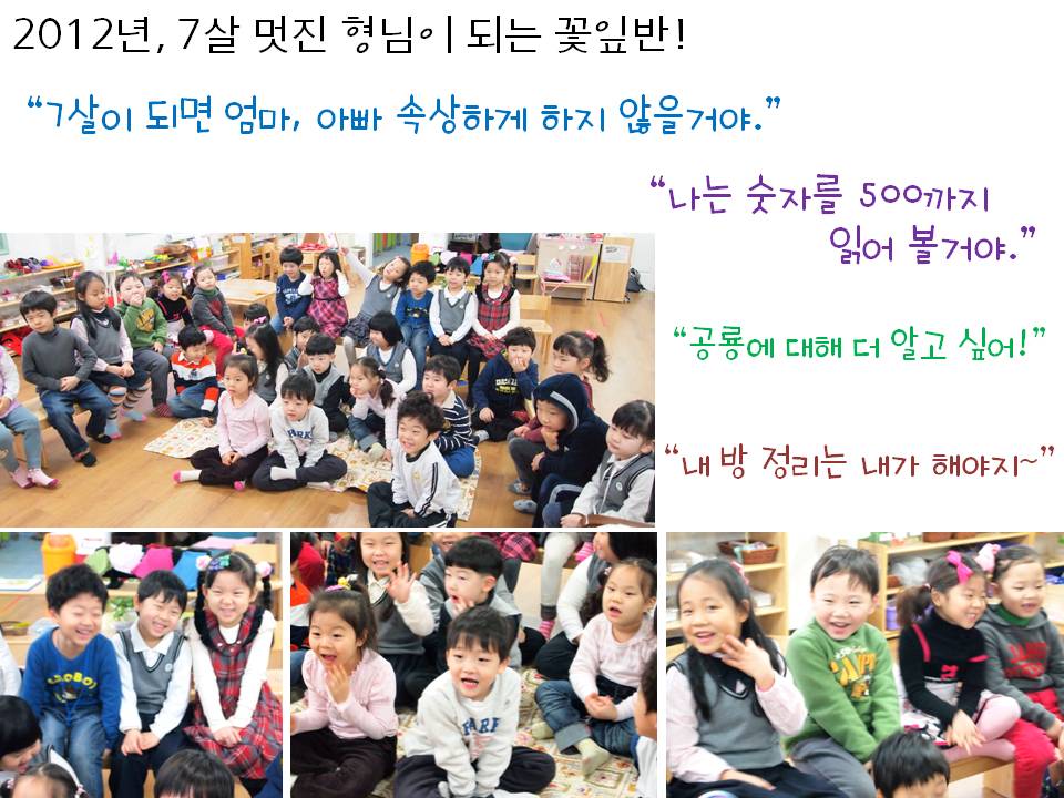2012년이 되면 유치원의 최고형님이 되는 꽃잎반 친구들과 함께 6살에서 7살이 되면 달라지는 것들에 대해 이야기 나누어 보았습니다.