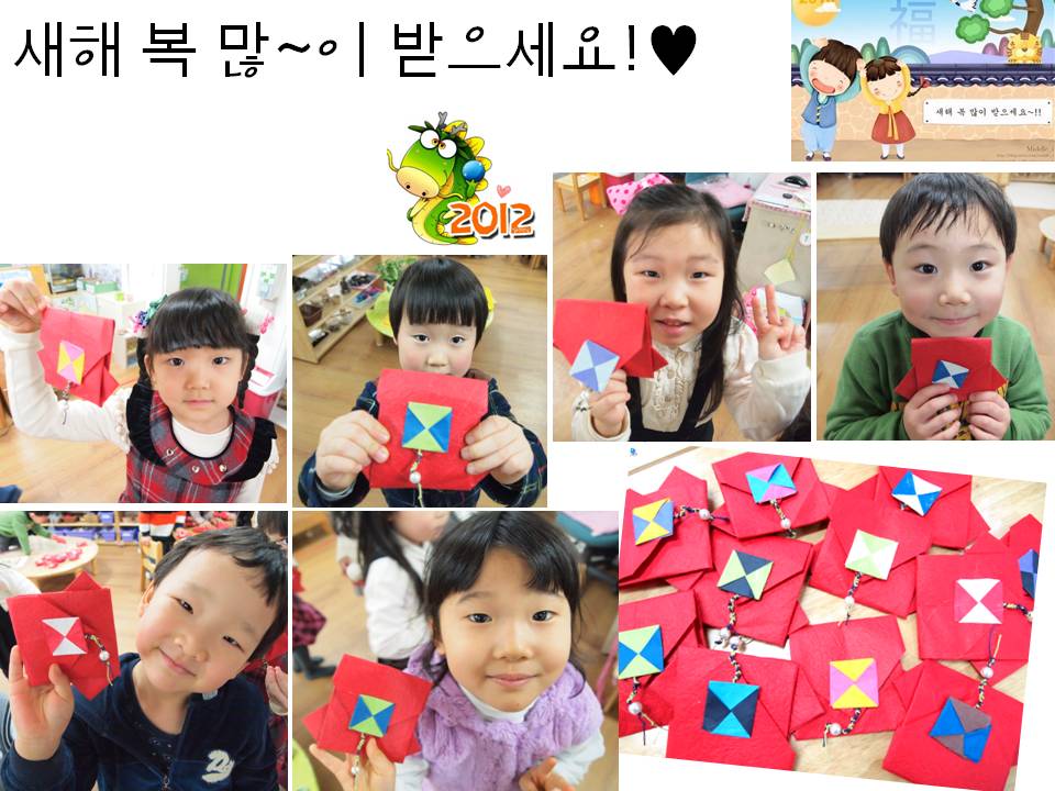 다가오는 설날을 맞이하여 친구들과 함께 설날의 풍속에 대해 알아보았습니다. 설날에 입는 새 옷과 양말, 신발을 통틀어 <설빔>이라고 하고, 세배를 드리고 좋은 말씀을 해주시는 것은 <덕담>이라고 합니다. 또 설날에 먹는 대표적인 음식인 떡국과 만둣국, 식혜 그리고 윷놀이, 투호놀이, 널뛰기 등 놀이에 대해서도 알아보았답니다. 복을 불러들이기 위해 차고 다니는 주머니인 <복주머니>도 만들어 보았습니다. 요즘 한창 놀이중인 딱지접기도 있어서인지 더 즐겁게 만들어 볼 수 있었답니다. 조금 어려운 부분은 친구들의 도움을 받기도 하고, 스스로 좀 더 연구해보며 완성되어가는 복주머니를 보며 뿌듯해하는 어린이들의 표정도 볼 수 있었답니다. 꽃잎반 가족 모두 행복하고 즐거운 명절 보내시고, 새해 복 많이 받으세요!