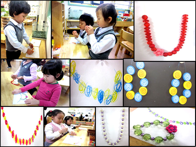 구슬 영역에서 아이들은 반짝이고 예쁜 구슬을 사용하여 목걸이, 팔찌, 반지 만들기를 합니다. 처음에는 내가 좋아하는 구슬을 자유롭게 꿰거나, 많이 꿰어 긴 악세사리 만들기를 하면서 구슬놀이의 즐거움을 알아갑니다. 이제는 계획성을 가지고 생각을 표현한 악세사리를 만들어 보기로 합니다.