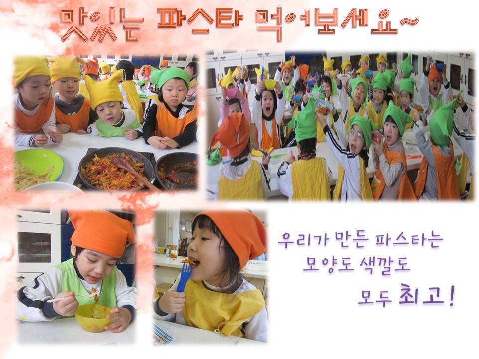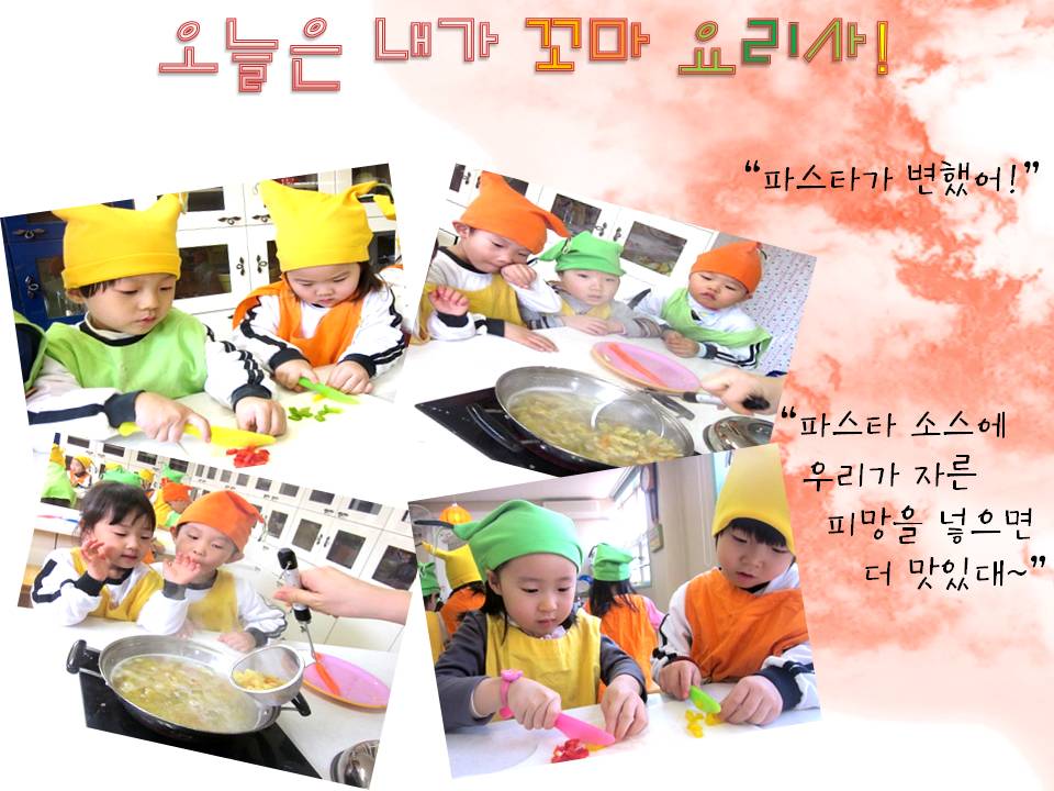 아이들은 완성하지 못한 악세사리는 디자인지를 보며 이어서 만들게 되고 더 완성도 높은 악세사리를 만들게 됩니다. 이렇게 디자인을 하며 생각을 1차적으로 가시화 시킨 후 구슬 매체를 사용하여 악세사리를 만들어 보는 활동은 아이들에게 자신이 계획한 것을 실행하여 결과물을 만들어 내는 경험을 안겨주었습니다. 앞으로 아이들은 얼마나 다양하고 아름다운 디자인의 악세사리를 만들어내게 될까요?<꼬마 요리사가 만드는 파스타!>