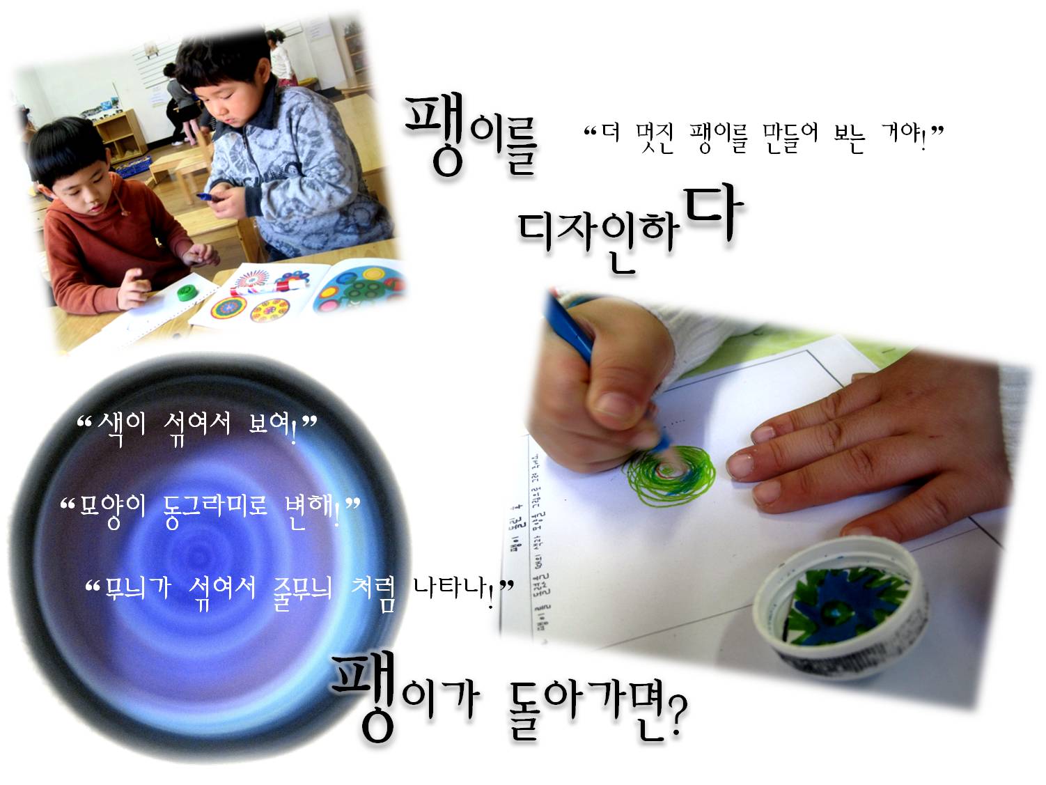 어린이들은 팽이를 돌리면서 팽이가 돌아갈 때의 색과 모양에도 관심을 가지게 됩니다.