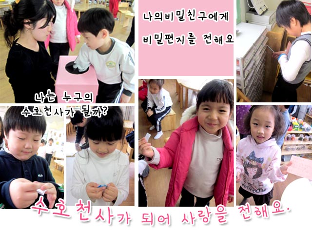 한 해를 마무리 하며 잎새반 친구들과 특별한 추억을 만들기위해 수호천사놀이를 해봅니다. ‘수호천사’란 친구들의 이름이 적힌 종이를 제비뽑기 하여, 내가 뽑은 친구의 수호천사가 되는 것입니다. 수호천사는 친구에게 도움을 주고, 사랑과 기쁨을 전하는 비밀친구이지요. “이건 비밀이야. 아무한테도 말하면 안돼.” “엄마, 아빠께도 말하지 않아야지!” “그런데 어떻게 하면 친구를 기쁘게 할 수 있지?” “친구를 도와주어야겠어.” “비밀 편지를 써서 전해줘야지.” “친구가 좋아하는 것을 만들어서 선물을 주어야겠다.” 누군가의 수호천사가 될 생각에 잎새반 친구들은 들뜨고 설레는 모습입니다. ‘수호천사’가 되어 사랑을 전하며, 친구를 생각하고 배려하는 뜻 깊은 시간이 되기를 기대해봅니다.