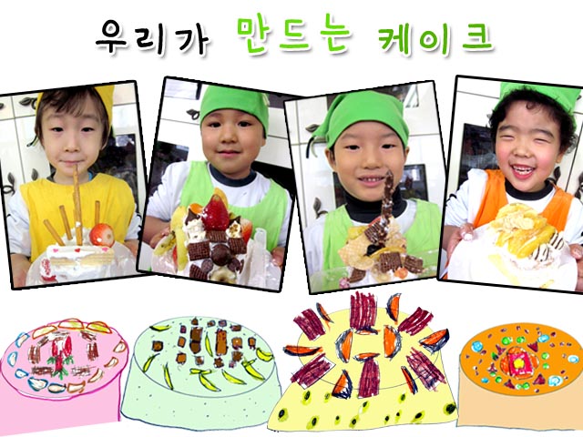 잎새반 친구들과 함께 케이크 만들기를 해보았습니다. “케잌은 생일이나, 축하하는 날에 먹어요.” “그럼 우리도 축하파티해요.” “그 동안 함께 지냈던 잎새반 친구들과 케이크를 만들어서 파티해요!” 어린이들은 케이크 파티를 할 부푼 마음을 안고 케이크 만들기를 시작해봅니다. 우선, 내가 만들고 싶은 케이크를 디자인합니다. “나는 자동차 모양 케이크를 만들어 볼거야.” “나는 꽃으로 가득 찬 꽃마을 케이크를 만들꺼야.” “딸기가 피어나는 화분을 만들어야겠어.” 케이크 만들기 계획을 마친 친구들은 케이크를 정성스럽게 만들어봅니다. 서툴지만 자신만의 의미가 담긴, 세상에서 하나 뿐인 케이크입니다. 친구들이 만든 케이크가 정말 먹음직스럽죠? 완성된 케이크를 함께 나누어 먹으며 즐거운 시간을 보내었습니다.