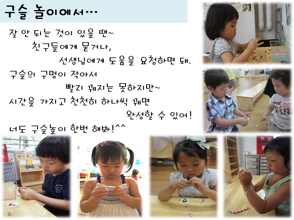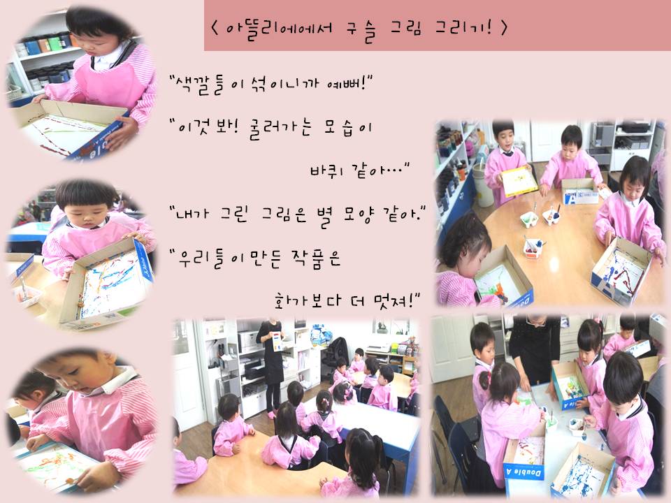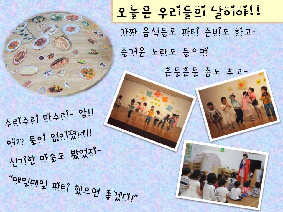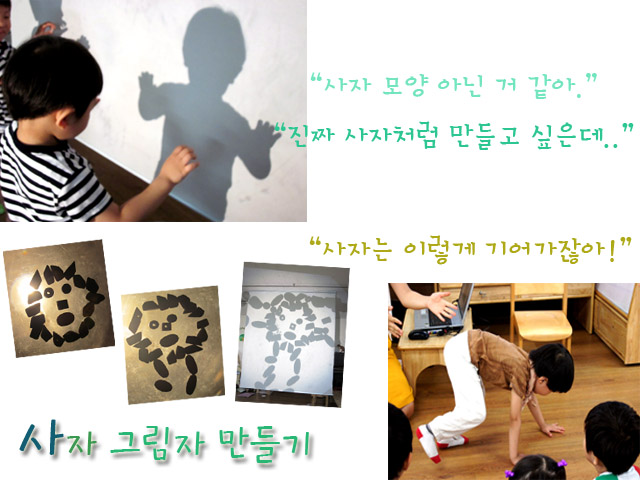 옛날에 엄마와 아빠가 만났어요. 엄마와 아빠는 뽀뽀를 하고 사랑을 했어요. 그리고 아기를 낳았어요. 엄마와 아빠 아기는 놀이공원으로 놀러 갔어요. 거기에서 길을 잃은 생쥐를 만났어요. 가족들은 생쥐를 집으로 데리고 와서 밥도 주고 국도주고 목욕도 해주었답니다. “선생님 친구들한테 보여주려면 연습을 더 해야겠어요.” “나는 의자 만들게.” “나는 팝콘이랑 쥐포 파는 사람.” “사람들아 영화 보러 오세요.” “긴바늘9에 가면 영화 시작해~” “선생님 여기 트랜스포머 써주세요. 이거는 로봇 영화 합니다 하고 알려주는 거예요.” “영화관 앞에 가면 그림 있잖아요. 그것 처럼요.” “자 이제 불끈다~!” 친구의 목소리가 들리자 불이 꺼지고 영화가 시작됩니다. “와~ 박수!!” 착한 가족 이야기가 끝나자 아이들의 칭찬박수 소리가 들려오고 연극에 함께 참여 했던 친구들은 보람됨을 느낌니다. “또 영화 보여주고 싶어요.” “우리 다른 이야기 지어 볼까?” “영화 너무 재밌어.” 영역놀이 중 일어난 미니 프로젝트 영화 만들기를 통해 아이들은 놀이를 스스로 만들어내고 확장 시켜가는 자발성과 친구들과 생각을 마주고 역할을 나누며 활동을 이끌어가는 <협동>을 경험 해 하게 됩니다.