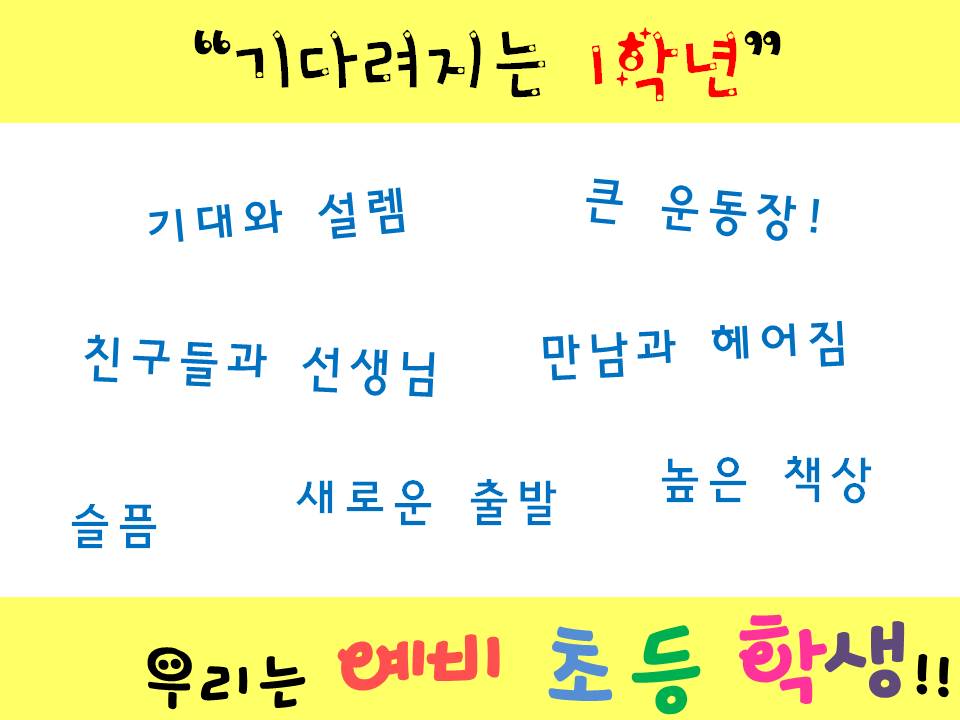 “초등학교에 가니깐 가슴이 두근거렸어” “우리 누나랑 같은 초등학교에 가게 되어서 진짜 기뻐!” “초등학교가 유치원 보다 조금 더 컸어!” “초등학교에 가면 새로운 친구를 만날 수 있으니깐 기대가 돼~”