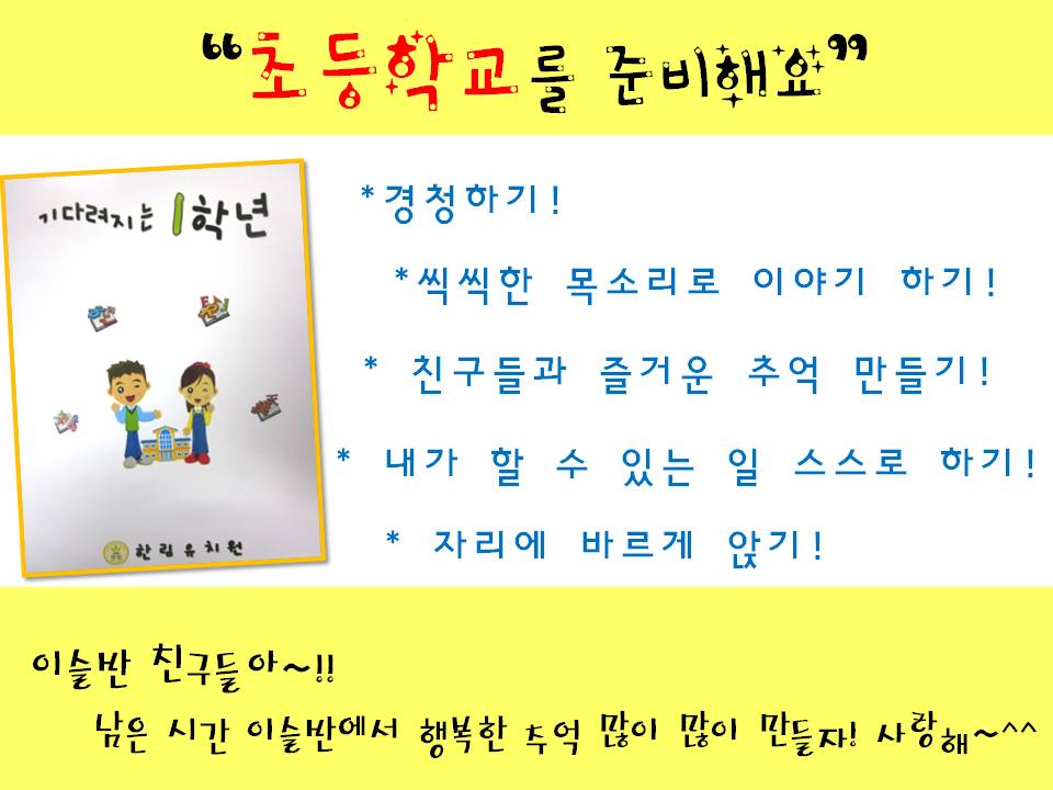 방학을 보내고 예비 초등학생으로 만난 이슬반 유아들은 새로운 시작에 대한 기대와 설레임으로 초등학교에 가기 위해서 준비해야 되는 것들을 생각해 봅니다.