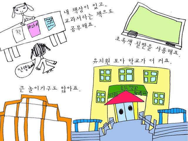새로운 환경은 늘 ‘설레임’과 ‘두려움’을 함께 가져다줍니다. ‘초등학교’라는 새로운 공간과 마주하게 될 어린이들이 ‘걱정스러운 마음’보다 ‘설레임과 기대’을 안고 가기를 바라며, 초등학교에 대해 알아보는 시간을 가집니다. “학교에서는 모두 책상에 앉아 공부를 해요. 그리고 교실 앞에 커다란 초록색 칠판이 있어요. 운동장도 유치원보다 크고, 학교도 유치원보다 더 커요. 1학년부터 6학년까지 있기 때문이에요. 학교에 가면 자유선택활동 시간이 없어요. 교과서라는 책을 가지고 수업을 들어요.” 닮은 듯 다른 점이 있는 유치원과 초등학교를 비교해보며 어린이들은 학교에 대해 알아갈 수 있었습니다. 앞으로 차근차근 하나씩 초등학교 생활에 대해 이해하는 시간을 가지려합니다. 가정에서도 잎새반 친구들의 학교에 대한 관심에 함께 귀 기울여주세요.^^
