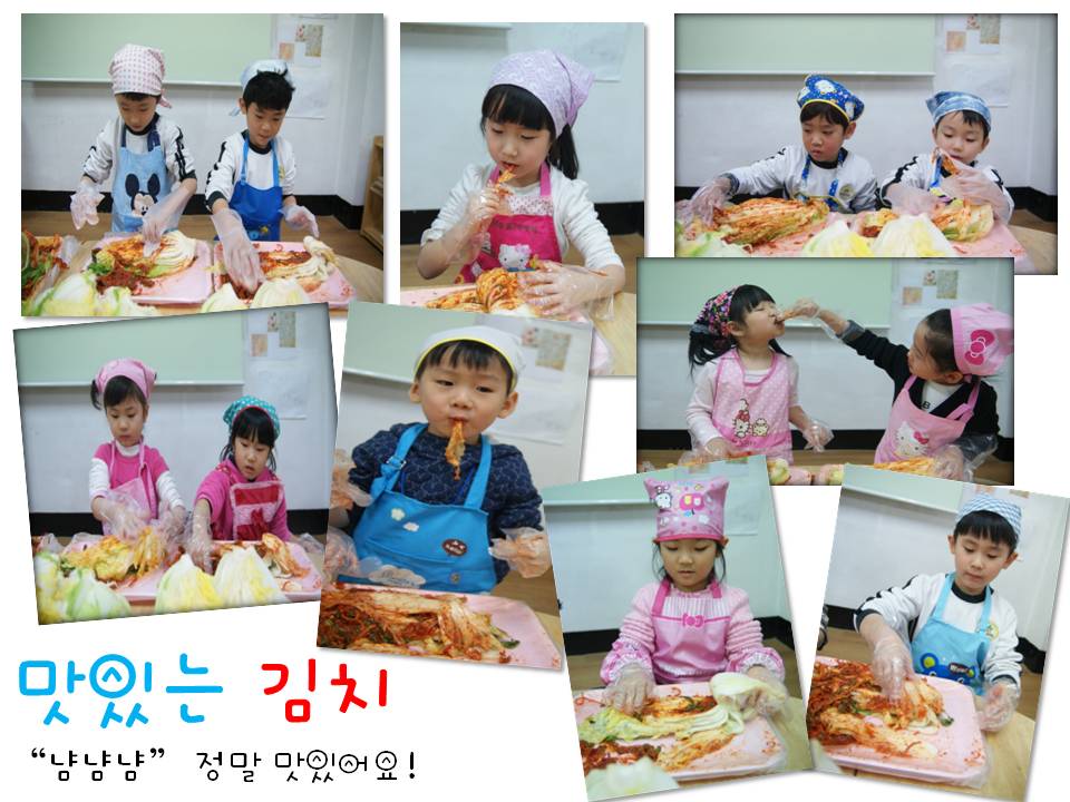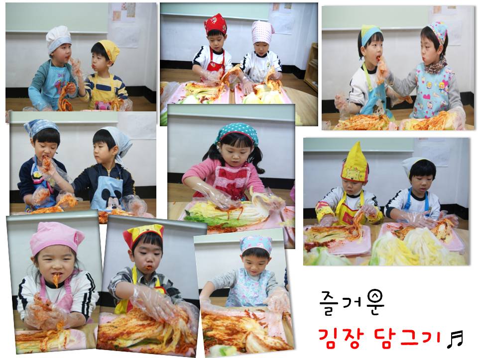 김치는 한식의 대표로서 세계 여러 나라에서 한국을 알릴 수 있는 문화입니다. 우리나라의 대표 문화라고 할 수 있는 김치를 함께 만들어 본다는 것은 그저 먹어보기만 했던 어린이들에게 새로운 경험이 될 것입니다. 김장 하기 전 겨울철에 김장을 하는 이유에 대해 알아봅니다. 교사: 햇살반 친구들~ 김장은 왜 하는 것일까요? “추운 겨울에 사람들이 힘이 없어서 맛있는 김장 김치를 먹고 튼튼해지기 위해서요.”“겨울에는 불쌍한 사람들을 도와주어야 해요. 그런 사람들을 위해 김장을 하는 것이예요.” 이야기를 나눈 후에 즐거운 김장 담그는 방법을 함께 알아보았답니다.