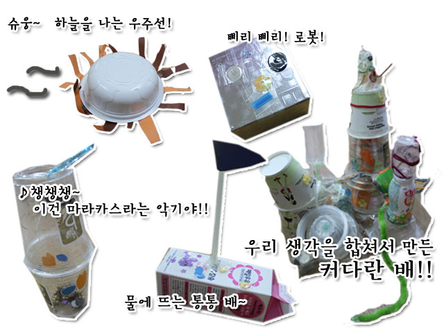“나는 우유 통으로 배 만들어야지~ 우유 통은 물에도 뜰 수 있어! 진짜 배처럼 물건도 실을 수 있을 걸?”