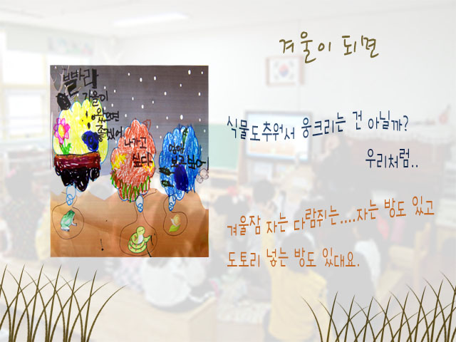 “창문 밖에 나무가 흔들리는 것을 보면 알수 있어요.” “우리 엄마, 아빠가 겨울이 왔다고 이야기 해 주었어요.”