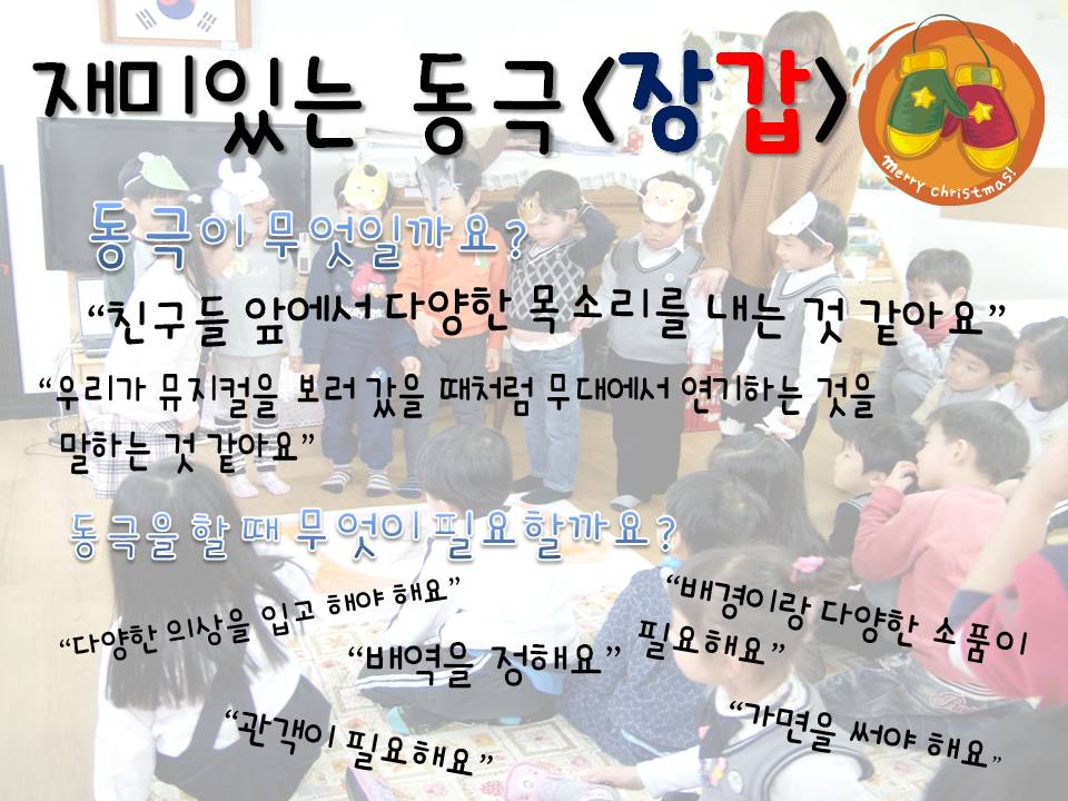 유아1:역할을 정해야 해요. 유아2:동극을 볼 사람도 필요해요. 유아3:동극에 필요한 소품을 만들어야 해요 우리는 장갑과 동물 머리띠가 필요해요.