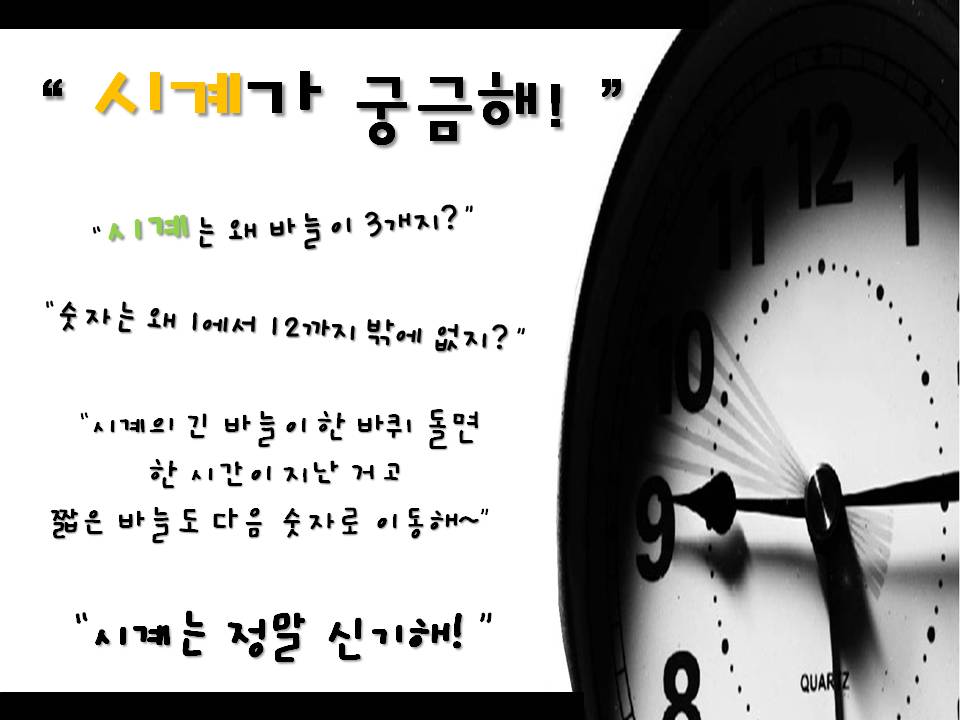 “시계는 바늘이 3개가 있는데 2개는 천천히 움직이고 하나는 계속 움직여~” “짧은 바늘은 시간이고 긴 바늘은 분이야~” “움직이는 바늘은 초!” “1분은 60초래~” “시계의 1은 5분~! 긴 바늘이 12까지 가면 60분! 60분은 1시간~”