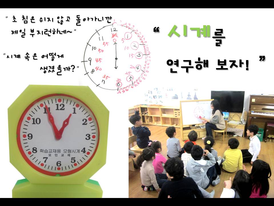 아이들과 시간 게임을 통해 시계 읽는 방법을 조금씩 익혀갑니다. 그리고 관심을 시계의 외부구조 뿐 아니라 내부구조로 확장되어 갑니다. 시계의 원리와 종류를 살펴보는 활동은 아이들에게 과학적 탐구의 기회와 시간의 소중함을 인식하고 하루를 알차고 보람 있게 보내는 방법을 생각해 볼 수 있는 시간이 될 것입니다.