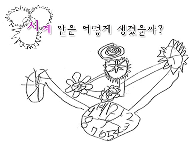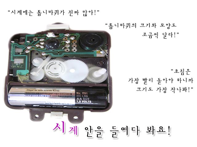 어린이들은 시계를 탐색하며 초침이 한 바퀴 돌면 분침이 한 칸, 분침이 한 바퀴 돌면 시침이 한 칸 움직이는 것을 알게 되면서 시계의 작동원리에 대해서 관심을 갖게 됩니다. 시계 안에는 무엇이 들어 있어 시계 바늘이 움직일 수 있는 것일까요?