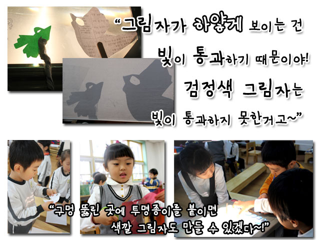 “색깔도 있으면 좋겠다! 색깔이 있는 투명 종이를 필요한 부분에 잘라서 붙이면 색깔 있는 그림자도 나오겠어! 투명종이는 빛이 지나가잖아~”
