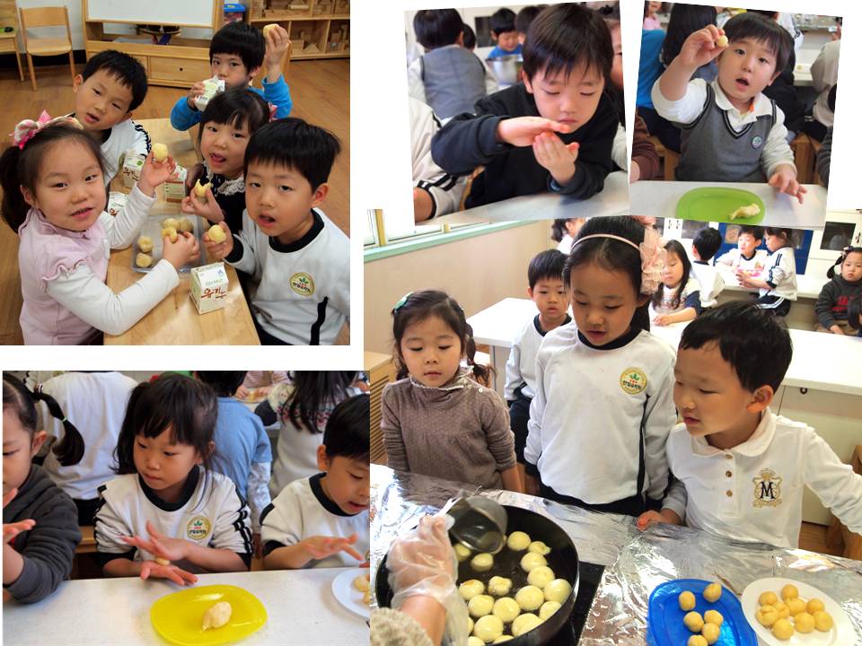 찹쌀도넛을 만들기 위한 필요한 재료와 도구, 만드는 순서와 주의해야 할 점에 대해 알아본 후 어린이들은 요리사가 되어봅니다. 찹쌀믹스, 포도씨유, 계란, 물을 볼에 넣은 후 거품기로 저어 반죽된 것을 메추리알 크기로 만들어 봅니다. 기름이 달궈진 후라이팬에 노릇노릇 튀겨 완성된 찹쌀 도넛! “아까는 매끈했는데 튀기니깐 까칠까칠해 졌어요.”, “도너츠가 점점 부풀어 올라요!”, “색깔도 더 진하게 변했어요!” 후라이팬에 들어가기 전과 후를 비교해보며 노릇노릇하게 익은 찹쌀도넛을 친구들과 함께 맛있게 먹었답니다.# 흙으로 꽃모양 촛대 만들기