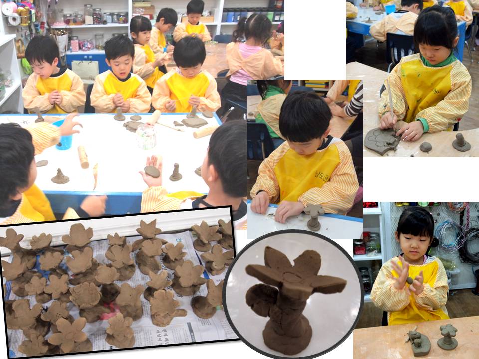 우리와 가까이 있는 흙과 친해진 어린이들은 흙에게 좀 더 많은 관심을 가지게 됩니다. 흙을 만져 본 느낌을 친구들과 함께 나누어보기도 하고, 흙으로 인해 새로운 식물이 태어나는 것을 보며 부쩍 흙의 소중함에 관심을 가집니다. 우리는 친해진 흙으로 촛대를 만들어 보는 시간을 가져보기로 합니다. “아기 때 양초 본 적 있어요.”, “절할 때 봤어요.”, “정전 나서 어두워지면 양초를 켜서 불을 밝혀요.”, “생일 케이크 할 때도 촛불이 있어요!” 옛날에는 지금처럼 전기로 형광등을 켜지 않고 양초를 촛대에 세워 불을 밝혔대요. 우리는 흙을 가지고 다양한 꽃잎을 만들어 꽃모양 촛대 만들기를 해 봅니다. 흙으로 조물조물 멋진 촛대가 완성 되었답니다.