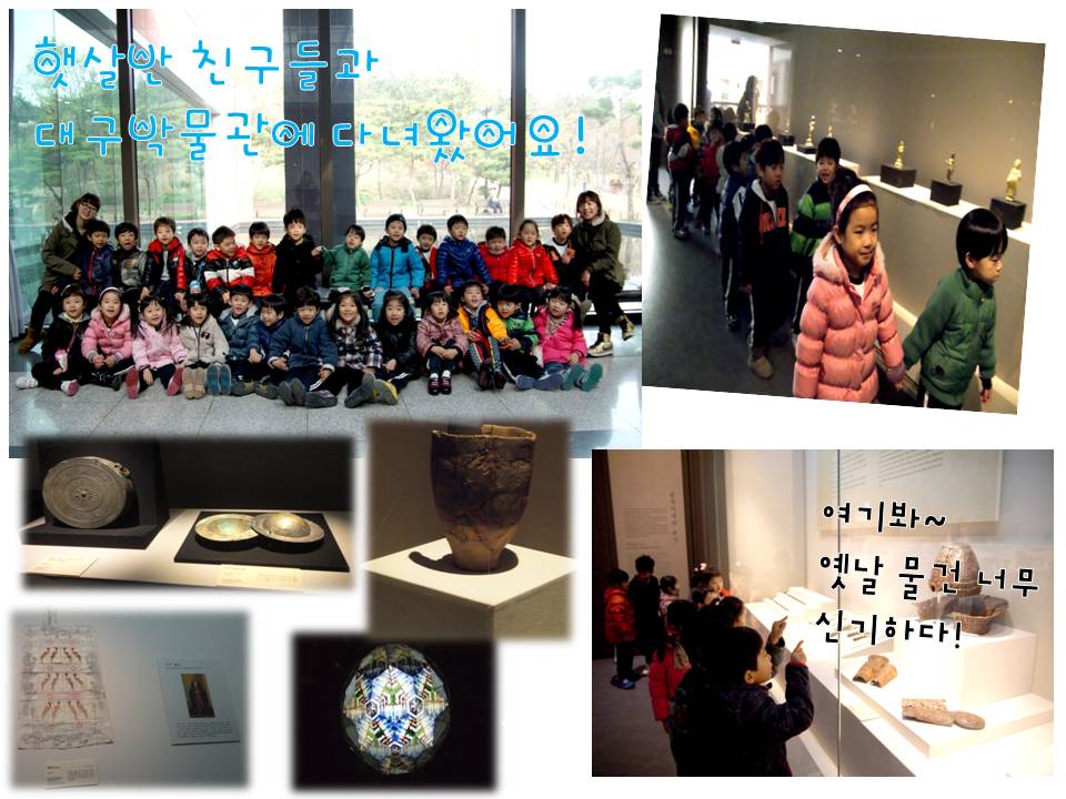햇살반 친구들과 함께 박물관 나들이! 박물관에는 많은 유물들이 전시되어져 있었고, 갖가지 신기한 물건들이 우리들의 눈길을 사로잡았습니다. 우리 옛 조상들께서 사용한 여러 가지 도구와 그릇 그리고 장신구들...하나하나의 설명들을 다 이해할 수는 없었지만 옛날 사람들의 여러 가지 문화와 생활들을 보며 신기해하는 아이들의 모습을 볼 수 있었습니다. C1:토기가 뭐지?그릇처럼 생겼어요.교사:맞아요 옛날에는 토기를 다른 말로 그릇이라고 했어요.C2:지금 우리가 사용하는 그릇보다 튼튼하고 단단해보여요.C3:옛날 것이라서 낡은 것 같아요. 잠깐이나마 박물관 안의 조상들이 사용한 물건과 모습을 보며 유아들의 머릿속에도 옛날 세상이 그려지는 소중한 시간이었답니다.<종이속심의 연구-팀별만남>