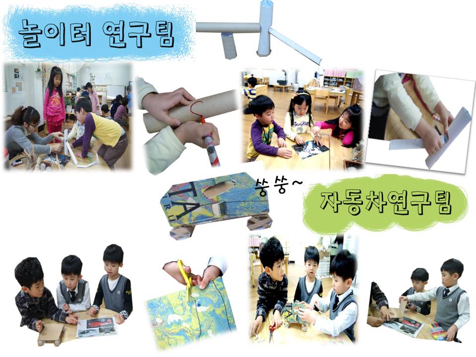지난 시간에 함께 연구하는 팀 중에서 만나지 못한 팀을 만나서 연구하는 작품에 어떤 크기의 종이심으로 만들어야 할지 생각해봅니다. “놀이터에는 그네도 있고 미끄럼틀도 있어”“성은 높고 깃발도 있고 군사도 있어” 우리가 만드는 작품을 자세하게 알아보기 위해서 인터넷으로 다양한 놀이터와 성의 모습을 찾아봅니다. 유아들은 연구하는 작품을 멋지게 완성하기 위해 종이속심을 다양한 크기로 잘라보기도 하고 여러 개를 붙어보기도 하며 다양하게 활용하여 작업을 시작합니다. 함께 머리를 맞대고 열심히 궁리하는 종이속심 연구 팀 아이들을 만나며 각자의 생각에 다른 친구의 생각을 더해서 더 멋진 작품으로 연구할 수 있는 소중한 시간이었답니다.<빛- 그림자는 왜 생길까?>