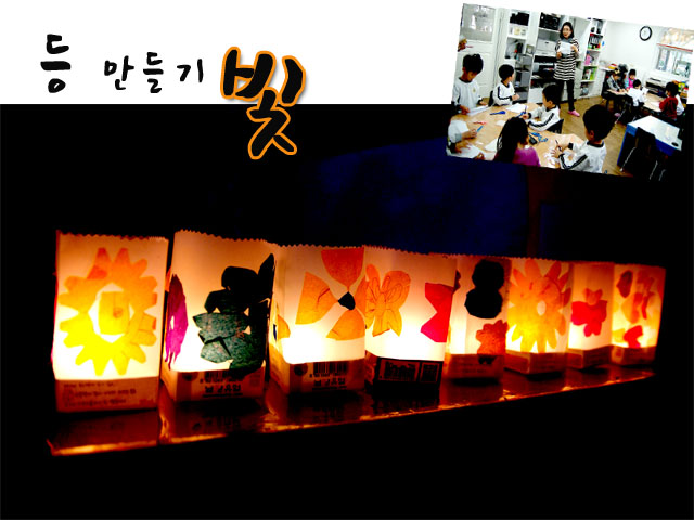 “OHP에는 불이 있어요.” “화장실 불이요.” “불이 났을 때도 빛이예요.” “”노란불도 있고 하얀불도 있어요.“ 빛을 은은하고 아름답게 만들어 주는 등을 만들어 보기로 합니다.