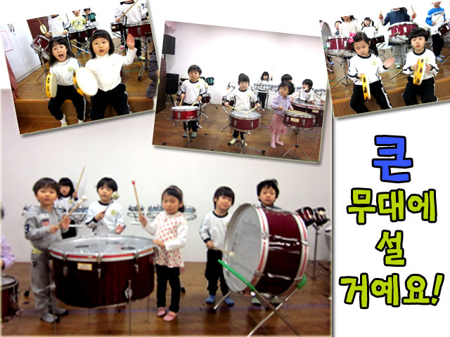 악기탐색이 끝나고 노래에 맞는 박자를 익히고 채를 잡아 봅니다. “어떻게 잡아요?” “채 진짜 길다~” “어! 큰 북 채는 마이크 같다.” 다양한 타악기를 많이 접해 보지 못한 아이들이기에 채를 잡는 것부터 차근차근 악기 다루는 법을 배워 갑니다. 그리고 박자에 맞게 악기를 연주 해 봅니다. “어? 이상하게 끝났다.” “너는 쿵 할 때 쳐야지. 나는 짝 할 때 쳐야 되고.” “아~ 조금 힘들다.” “팔 아프다.” “나는 힘들어도 열심히 할 수 있는데” “큰 무대에 올라갈 생각하면 기분이 좋아요.” “엄마 아빠 다 보러 오시잖아요.” “그런데 좀 부끄러울 거 같기도 해요.” “연습하면 부끄러운 마음도 없어져요.” “선생님 눈 보고 할 거예요.”
