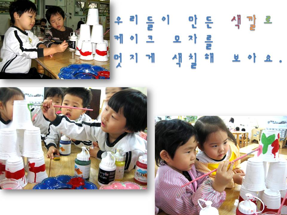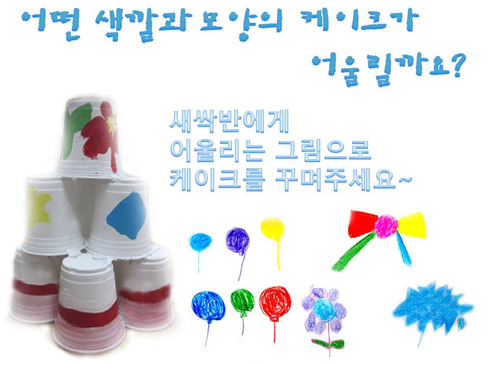 아이들이 본 케이크의 색깔과 모양들을 이야기 나누며 하얀색, 빨간색, 하늘색의 케이크 색깔을 정하게 됩니다.