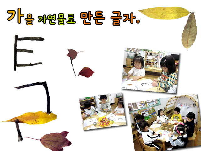 아이들은 떨어진 가을 나뭇잎을 활용하여 놀이하는 과정에서 모양을 표상하는 능력과 더불어 글자를 알아가는 또 다른 즐거움을 느끼게 해 주었습니다.