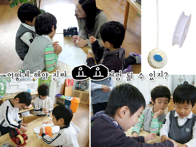 여러 가지 종류의 재활용품은 어린이들이 조형영역에서 활발하게 사용하는 매체입니다. 어린이들은 조형영역의 여러 가지 뚜껑들로 흔히 집에서 가지고 노는 <요요>를 구성하고자 합니다. 그러나 어린이들이 처음에 만든 요요는 동그란 병뚜껑에 테이프로 줄이 연결된 것이었습니다. 요요의 비슷한 형태를 재현하는 데는 성공했으나 요요의 가장 큰 특징인 오르락내리락하는 것은 만족시키지 못하였지요. 그래서 어린이들은 이러한 요요의 특징을 재현하기 위해 요즘 계속 연구하고 있답니다. 병뚜껑에 구멍을 뚫어 그 사이에 나뭇가지를 연결하는 방법, 또 병뚜껑 2개 사이에 작은 병뚜껑을 붙여 작은 병뚜껑에 실을 거는 방법 등 어린이들의 생각을 실현해 내길 기대합니다.