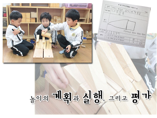 -놀이를 계획하고 실행으로 옮기며 어린이들의 놀이는 점점 확대되어지기도 하고, 세밀해지기도 합니다. 그리고 놀이에 대한 평가를 하며, 다시 이 놀이를 했을 때에 대한 기대와 또 다른 계획을 세워가게 됩니다. 이렇게 놀이를 <계획-실행-평가>하는 과정 속에서 어린이들은 보다 의미 있는 놀이를 찾아가게 됩니다.