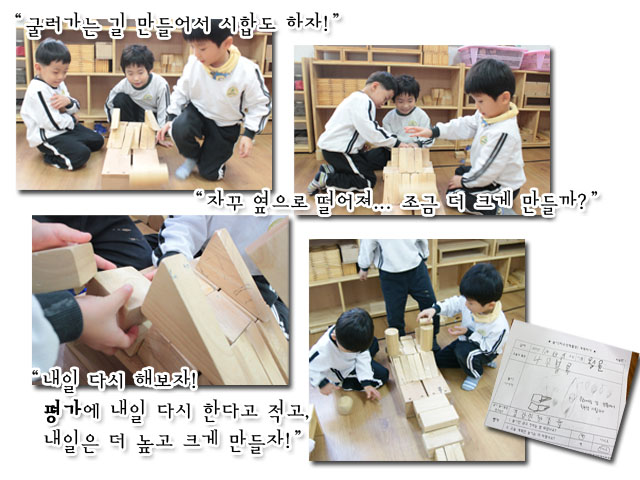 “야~ 블록이 잘 굴러가야 되는데 자꾸 옆으로 떨어진다.” “블록이 안 떨어지게 조금 더 넓게 만들자. 더 튼튼해야 돼!” “너무 빨리 떨어진다. 시시해! 조금 더 높이 만들자. 더 크게!”