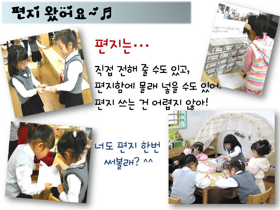 새싹들이 쓰는 편지는 친구와 내가 더욱 깊이 있게 관계를 맺을 수 있도록 도와주는 매개체 역할을 합니다.편지쓰기를 통해 자연스럽게 글자에 관심을 가지게 되는 유아들의 이야기를 기대 해 봅니다.