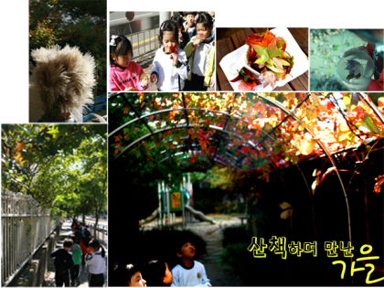 아침저녁으로 서늘한 바람이 우리들의 코끝을 스칩니다. 쌀쌀해진 날씨에 우리의 몸에도 변화가 생기고 유치원 주변에서도 많은 변화가 생겼답니다. 주변을 산책하며 가을을 느낄 수 있는 자연의 변화를 찾아봅니다. 나뭇잎과 꽃 등을 손으로 만져도 보고 냄새도 맡아보고 소리를 듣는 등 오감을 사용하여 가을을 느껴봅니다. 또, 가을을 느낄 수 있는 자연물을 찾아 채집통에 담아봅니다.“선생님~여기 커다란 빨간색 단풍잎이 있어요.”“나뭇잎 색깔이 알록달록해요.” “낙엽은 만져보니까 부스럭 과자 먹는 소리가 나는 것 같아요.” 산책을 통해 유치원 마당과 주변에서 가을의 변화를 함께 느끼며 찾아보고 관찰하면서 우리 곁의 가을을 더욱 구체적으로 표현해 보는 시간이 되었답니다.<가을의 색을 찾아서>