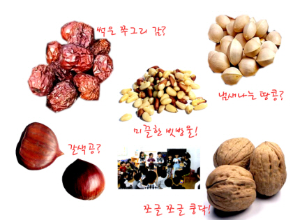 수확하는 계절 가을에는 어떤 열매를 만날 수 있는지 궁금해서 다양한 열매(밤,호두,잣등)를 실물화상기를 이용해서 열매의 특징을 관찰했답니다. 열매가 든 소리상자를 가지고 가서 소리를 들어보고 어떤 열매의 소리인지 예측도 하고 열매의 특징을 관찰하여 별명도 지어줍니다. 친구들이 지은 열매의 별명을 듣고 어떤 열매인지 맞추기도 했답니다.교사:별명을 잘 들어보고 어떤 열매인지 맞혀보세요.“갈색공, 얼굴 쪼글쪼글, 냄새나는 사과주황호박,썩은 갈색 감” 정답은?유아1:은행? 땡!유아2:호두 딩동댕!친구들과 가을열매를 관찰함으로써 가을에 볼 수 있는 다양한 열매의 특징과 관심을 가질 수 있었답니다. 주말에 가을에 볼 수 있는 열매나 자연물을 찾아보는 것은 어떨까요?<가을철 먹을거리- 맛있는 고구마 경단 만들기>