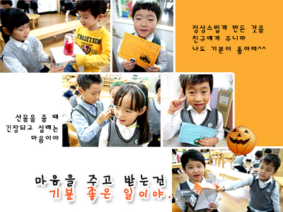 복장을 갖추어 입은 어린이들은 할로윈데이의 전통에 맞게 사탕과 초콜렛 등 달콤한 음식을 나누어 먹습니다. 친구들과 함께 나누어 먹으니 더 맛있게 느껴집니다.* 마음을 담은 선물과 편지를 주고 받아요.