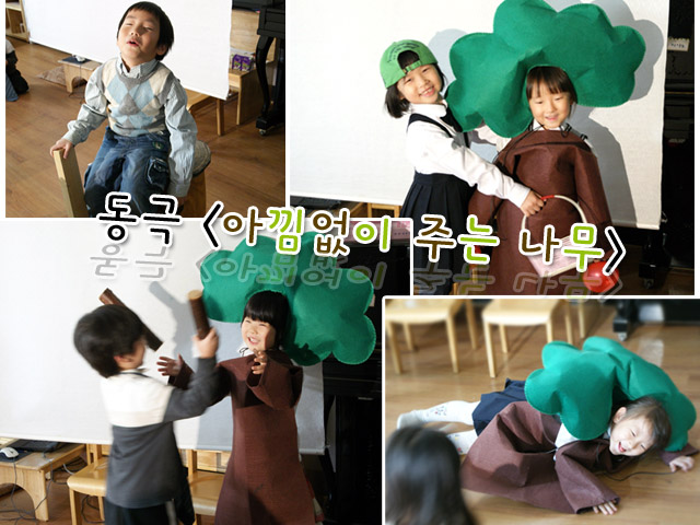 <아낌없이 주는 나무> 동화를 좋아하는 어린이들과 함께 동극을 해 보았습니다. 직접 나무가 되고 소년이 되어 친구들 앞에서 동극을 해 봅니다. 교사의 지문에 맞추어 행동도 하고 역할이나 상황에 맞는 표정도 지어봅니다. 조금 떨리기도 하지만 우리가 좋아하는 동화를 직접 동극으로 해본다는 것이 정말 즐겁습니다.